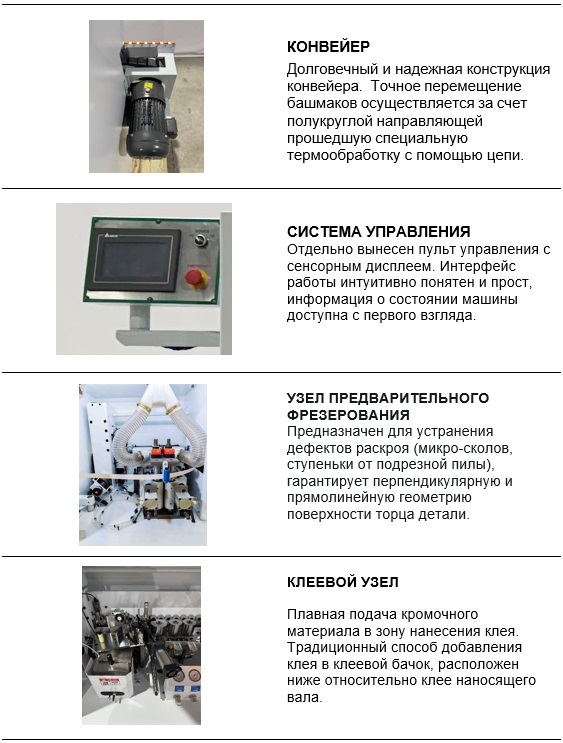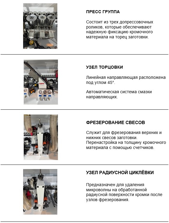 Назначение: Односторонний кромкооблицовочный станок предназначен для оклейки прямоугольных заготовок различными кромочными материалами: ПВХ, ABС, Акриловые. Нанесение кромочного материала в режимах продольной и поперечной обработки.